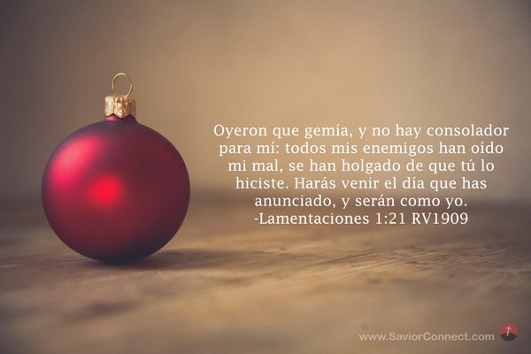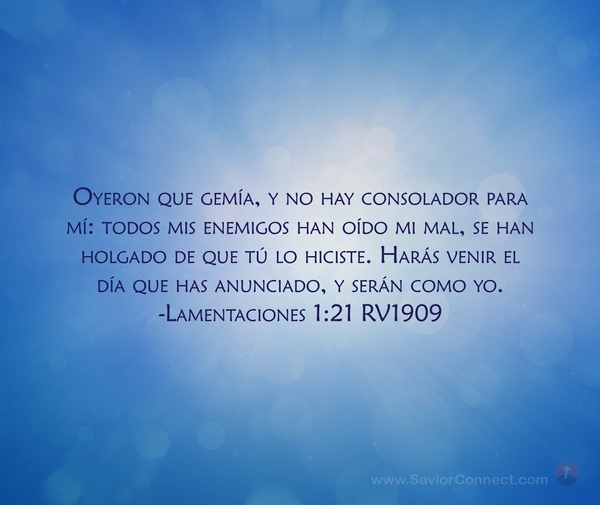 Oyeron que gemía, y no hay consolador para mí: todos mis enemigos han oído mi mal, se han holgado de que tú lo hiciste. Harás venir el día que has anunciado, y serán como yo. -Lamentaciones 1:21 RV1909