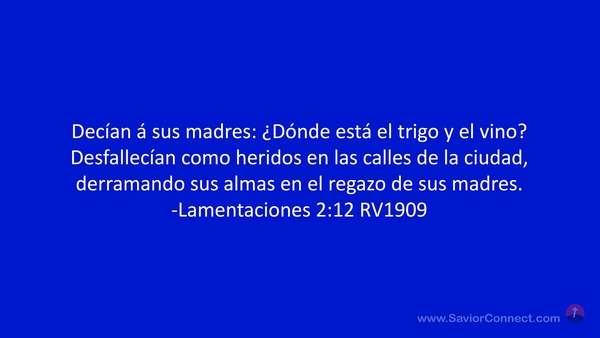 Decían á sus madres: ¿Dónde está el trigo y el vino? Desfallecían como heridos en las calles de la ciudad, derramando sus almas en el regazo de sus madres. -Lamentaciones 2:12 RV1909