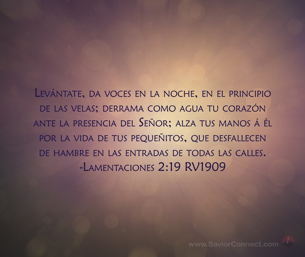 Levántate, da voces en la noche, en el principio de las velas; derrama como agua tu corazón ante la presencia del Señor; alza tus manos á él por la vida de tus pequeñitos, que desfallecen de hambre en las entradas de todas las calles. -Lamentaciones 2:19 RV1909