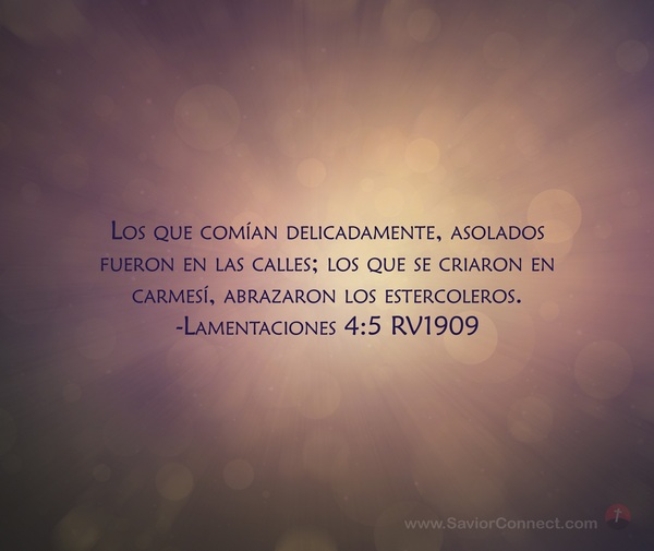 Los que comían delicadamente, asolados fueron en las calles; los que se criaron en carmesí, abrazaron los estercoleros. -Lamentaciones 4:5 RV1909