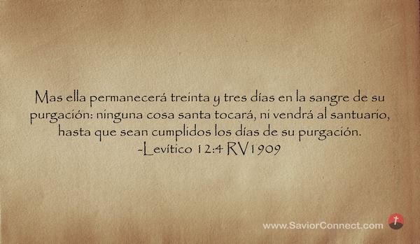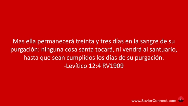 Mas ella permanecerá treinta y tres días en la sangre de su purgación: ninguna cosa santa tocará, ni vendrá al santuario, hasta que sean cumplidos los días de su purgación. -Levítico 12:4 RV1909