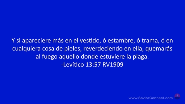 Y si apareciere más en el vestido, ó estambre, ó trama, ó en cualquiera cosa de pieles, reverdeciendo en ella, quemarás al fuego aquello donde estuviere la plaga. -Levítico 13:57 RV1909