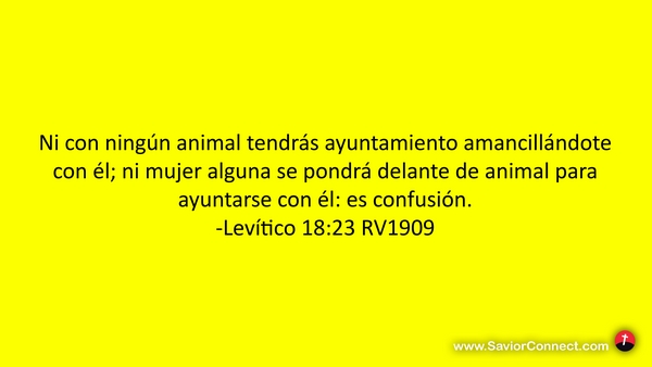 Ni con ningún animal tendrás ayuntamiento amancillándote con él; ni mujer alguna se pondrá delante de animal para ayuntarse con él: es confusión. -Levítico 18:23 RV1909
