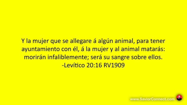 Y la mujer que se allegare á algún animal, para tener ayuntamiento con él, á la mujer y al animal matarás: morirán infaliblemente; será su sangre sobre ellos. -Levítico 20:16 RV1909