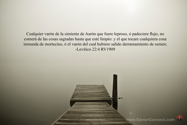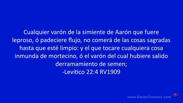 Cualquier varón de la simiente de Aarón que fuere leproso, ó padeciere flujo, no comerá de las cosas sagradas hasta que esté limpio: y el que tocare cualquiera cosa inmunda de mortecino, ó el varón del cual hubiere salido derramamiento de semen; -Levítico 22:4 RV1909