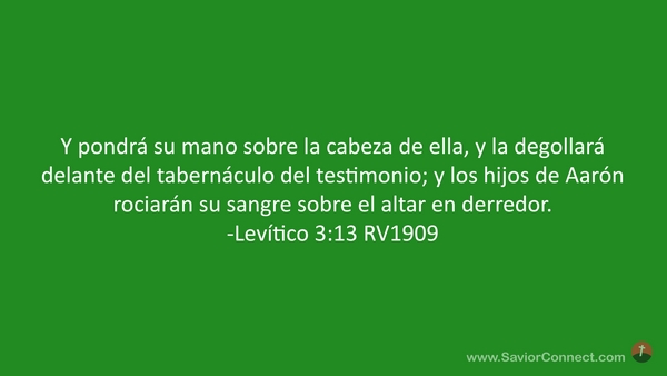 Y pondrá su mano sobre la cabeza de ella, y la degollará delante del tabernáculo del testimonio; y los hijos de Aarón rociarán su sangre sobre el altar en derredor. -Levítico 3:13 RV1909