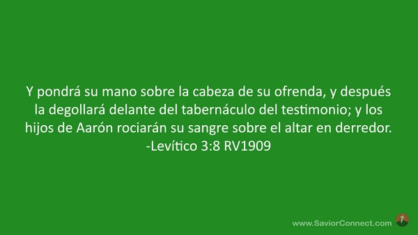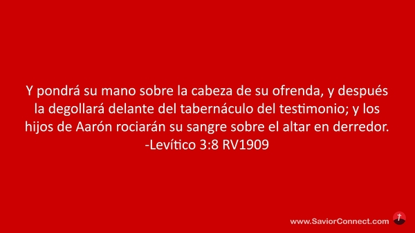 Y pondrá su mano sobre la cabeza de su ofrenda, y después la degollará delante del tabernáculo del testimonio; y los hijos de Aarón rociarán su sangre sobre el altar en derredor. -Levítico 3:8 RV1909