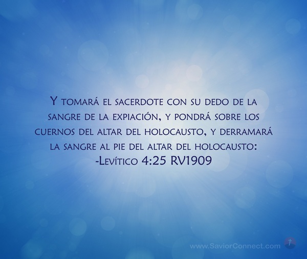 Y tomará el sacerdote con su dedo de la sangre de la expiación, y pondrá sobre los cuernos del altar del holocausto, y derramará la sangre al pie del altar del holocausto: -Levítico 4:25 RV1909