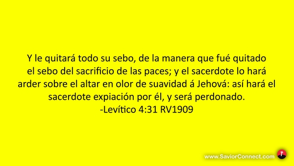 Y le quitará todo su sebo, de la manera que fué quitado el sebo del sacrificio de las paces; y el sacerdote lo hará arder sobre el altar en olor de suavidad á Jehová: así hará el sacerdote expiación por él, y será perdonado. -Levítico 4:31 RV1909