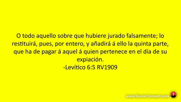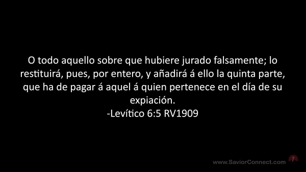 O todo aquello sobre que hubiere jurado falsamente; lo restituirá, pues, por entero, y añadirá á ello la quinta parte, que ha de pagar á aquel á quien pertenece en el día de su expiación. -Levítico 6:5 RV1909