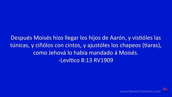 Después Moisés hizo llegar los hijos de Aarón, y vistióles las túnicas, y ciñólos con cintos, y ajustóles los chapeos (tiaras), como Jehová lo había mandado á Moisés. -Levítico 8:13 RV1909