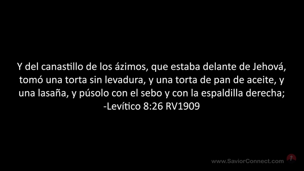 Y del canastillo de los ázimos, que estaba delante de Jehová, tomó una torta sin levadura, y una torta de pan de aceite, y una lasaña, y púsolo con el sebo y con la espaldilla derecha; -Levítico 8:26 RV1909