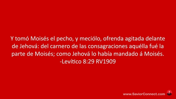 Y tomó Moisés el pecho, y meciólo, ofrenda agitada delante de Jehová: del carnero de las consagraciones aquélla fué la parte de Moisés; como Jehová lo había mandado á Moisés. -Levítico 8:29 RV1909