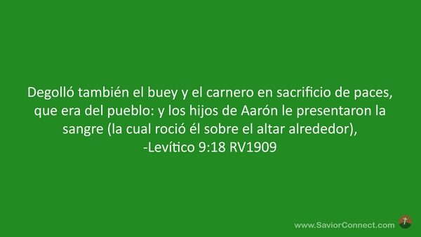 Degolló también el buey y el carnero en sacrificio de paces, que era del pueblo: y los hijos de Aarón le presentaron la sangre (la cual roció él sobre el altar alrededor), -Levítico 9:18 RV1909