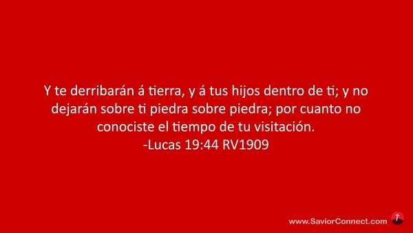 Y te derribarán á tierra, y á tus hijos dentro de ti; y no dejarán sobre ti piedra sobre piedra; por cuanto no conociste el tiempo de tu visitación. -Lucas 19:44 RV1909