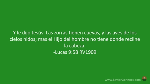 Y le dijo Jesús: Las zorras tienen cuevas, y las aves de los cielos nidos; mas el Hijo del hombre no tiene donde recline la cabeza. -Lucas 9:58 RV1909