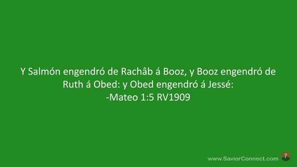 Y Salmón engendró de Rachâb á Booz, y Booz engendró de Ruth á Obed: y Obed engendró á Jessé: -Mateo 1:5 RV1909