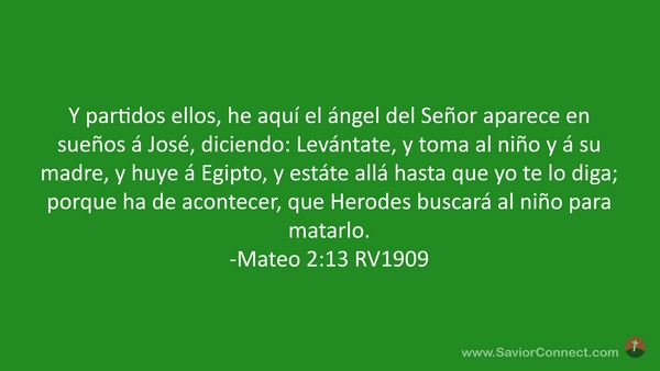 Y partidos ellos, he aquí el ángel del Señor aparece en sueños á José, diciendo: Levántate, y toma al niño y á su madre, y huye á Egipto, y estáte allá hasta que yo te lo diga; porque ha de acontecer, que Herodes buscará al niño para matarlo. -Mateo 2:13 RV1909