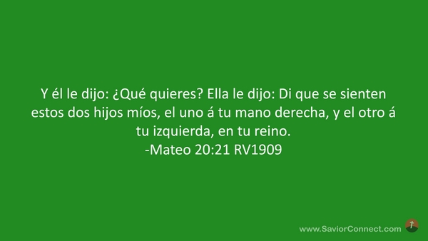 Y él le dijo: ¿Qué quieres? Ella le dijo: Di que se sienten estos dos hijos míos, el uno á tu mano derecha, y el otro á tu izquierda, en tu reino. -Mateo 20:21 RV1909