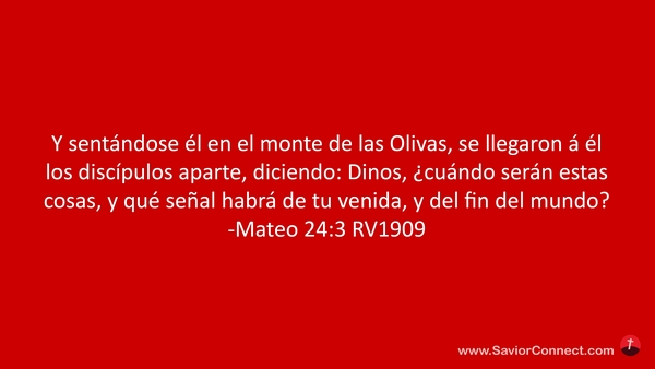 Y sentándose él en el monte de las Olivas, se llegaron á él los discípulos aparte, diciendo: Dinos, ¿cuándo serán estas cosas, y qué señal habrá de tu venida, y del fin del mundo? -Mateo 24:3 RV1909