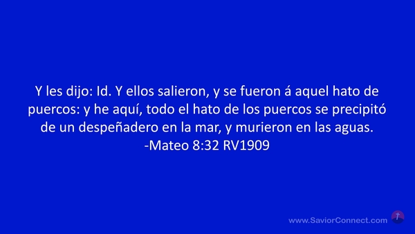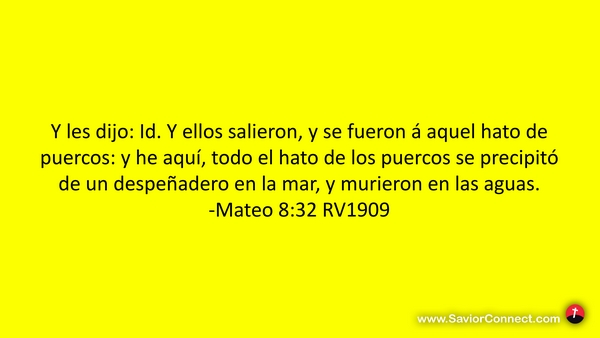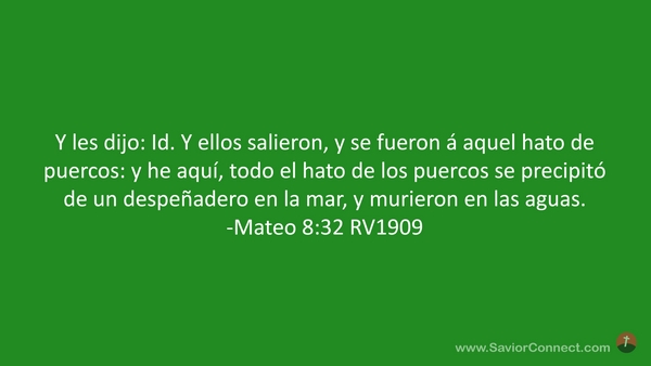 Y les dijo: Id. Y ellos salieron, y se fueron á aquel hato de puercos: y he aquí, todo el hato de los puercos se precipitó de un despeñadero en la mar, y murieron en las aguas. -Mateo 8:32 RV1909