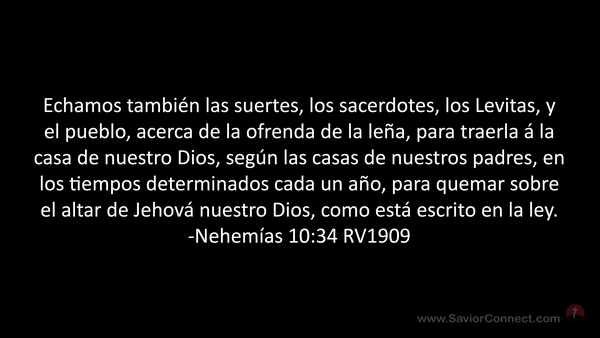 Echamos también las suertes, los sacerdotes, los Levitas, y el pueblo, acerca de la ofrenda de la leña, para traerla á la casa de nuestro Dios, según las casas de nuestros padres, en los tiempos determinados cada un año, para quemar sobre el altar de Jehová nuestro Dios, como está escrito en la ley. -Nehemías 10:34 RV1909