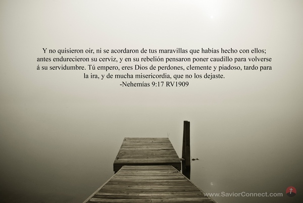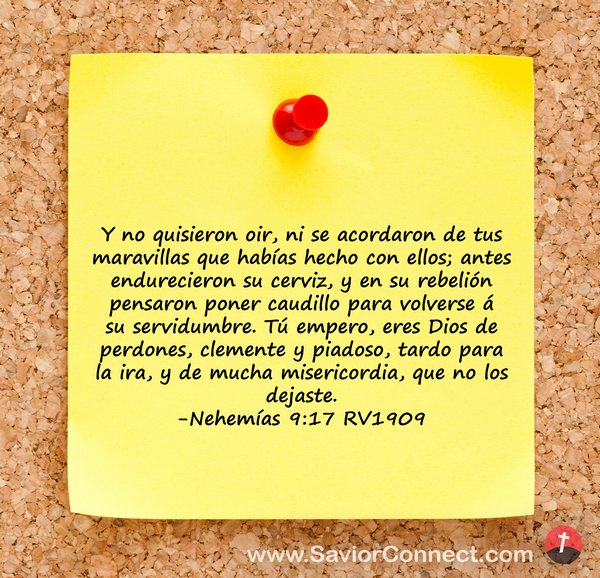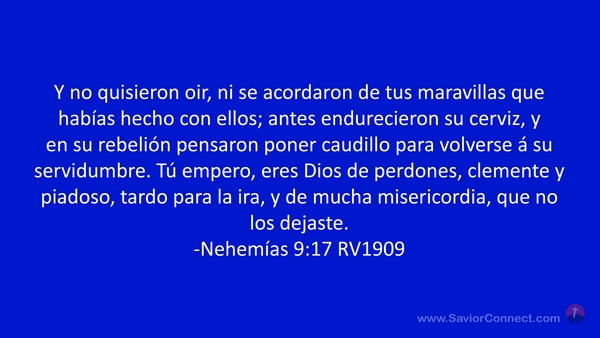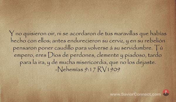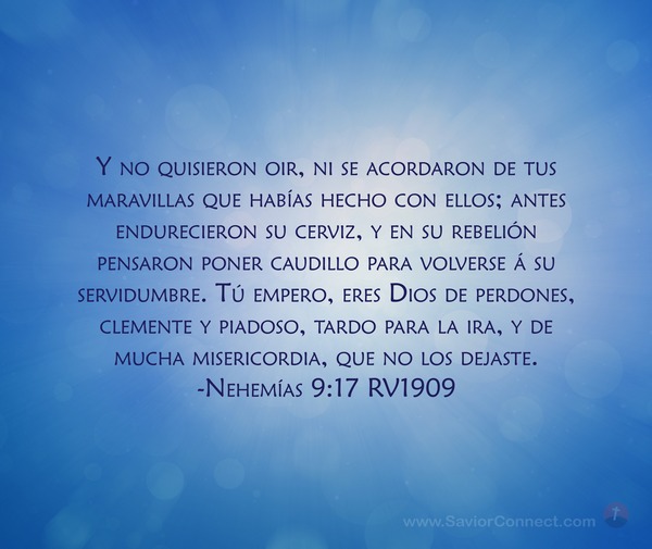 Y no quisieron oir, ni se acordaron de tus maravillas que habías hecho con ellos; antes endurecieron su cerviz, y en su rebelión pensaron poner caudillo para volverse á su servidumbre. Tú empero, eres Dios de perdones, clemente y piadoso, tardo para la ira, y de mucha misericordia, que no los dejaste. -Nehemías 9:17 RV1909
