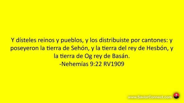 Y dísteles reinos y pueblos, y los distribuiste por cantones: y poseyeron la tierra de Sehón, y la tierra del rey de Hesbón, y la tierra de Og rey de Basán. -Nehemías 9:22 RV1909