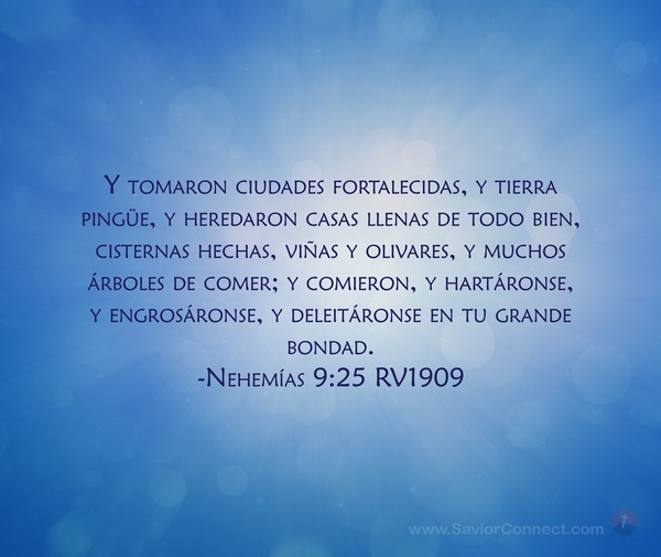 Y tomaron ciudades fortalecidas, y tierra pingüe, y heredaron casas llenas de todo bien, cisternas hechas, viñas y olivares, y muchos árboles de comer; y comieron, y hartáronse, y engrosáronse, y deleitáronse en tu grande bondad. -Nehemías 9:25 RV1909