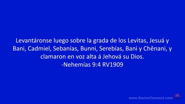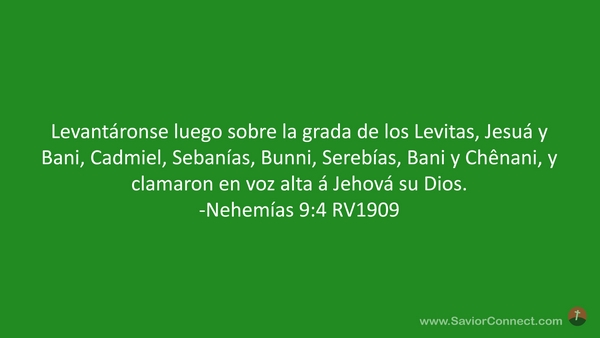 Levantáronse luego sobre la grada de los Levitas, Jesuá y Bani, Cadmiel, Sebanías, Bunni, Serebías, Bani y Chênani, y clamaron en voz alta á Jehová su Dios. -Nehemías 9:4 RV1909