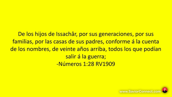 De los hijos de Issachâr, por sus generaciones, por sus familias, por las casas de sus padres, conforme á la cuenta de los nombres, de veinte años arriba, todos los que podían salir á la guerra; -Números 1:28 RV1909
