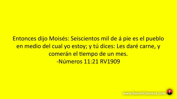 Entonces dijo Moisés: Seiscientos mil de á pie es el pueblo en medio del cual yo estoy; y tú dices: Les daré carne, y comerán el tiempo de un mes. -Números 11:21 RV1909