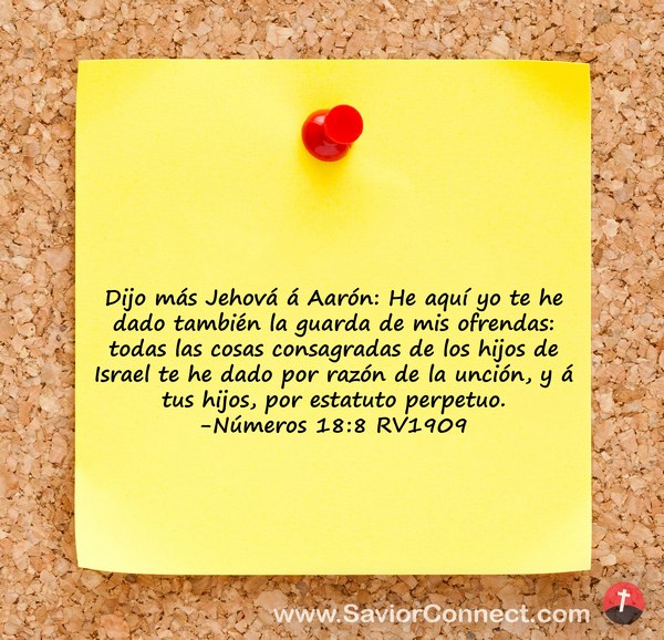 Dijo más Jehová á Aarón: He aquí yo te he dado también la guarda de mis ofrendas: todas las cosas consagradas de los hijos de Israel te he dado por razón de la unción, y á tus hijos, por estatuto perpetuo. -Números 18:8 RV1909