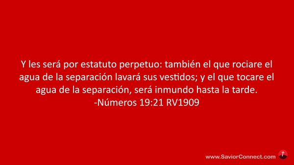 Y les será por estatuto perpetuo: también el que rociare el agua de la separación lavará sus vestidos; y el que tocare el agua de la separación, será inmundo hasta la tarde. -Números 19:21 RV1909