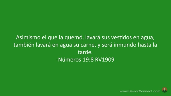 Asimismo el que la quemó, lavará sus vestidos en agua, también lavará en agua su carne, y será inmundo hasta la tarde. -Números 19:8 RV1909