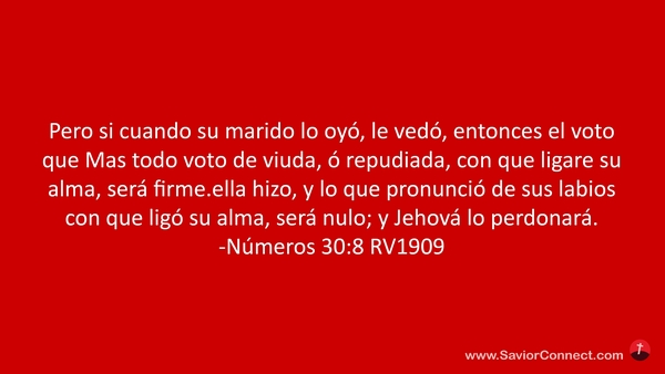 Pero si cuando su marido lo oyó, le vedó, entonces el voto que Mas todo voto de viuda, ó repudiada, con que ligare su alma, será firme.ella hizo, y lo que pronunció de sus labios con que ligó su alma, será nulo; y Jehová lo perdonará. -Números 30:8 RV1909