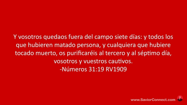 Y vosotros quedaos fuera del campo siete días: y todos los que hubieren matado persona, y cualquiera que hubiere tocado muerto, os purificaréis al tercero y al séptimo día, vosotros y vuestros cautivos. -Números 31:19 RV1909
