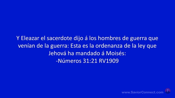 Y Eleazar el sacerdote dijo á los hombres de guerra que venían de la guerra: Esta es la ordenanza de la ley que Jehová ha mandado á Moisés: -Números 31:21 RV1909