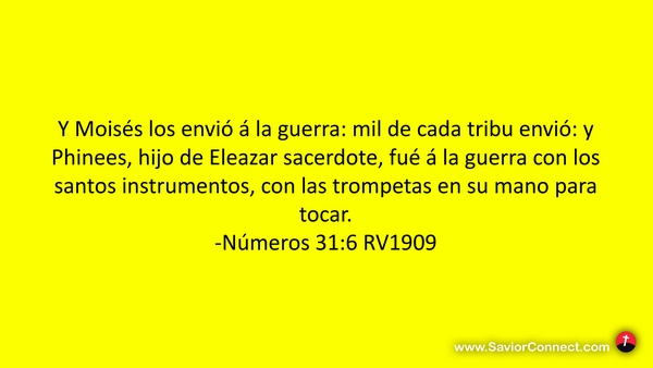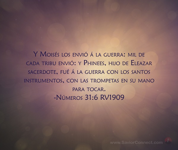 Y Moisés los envió á la guerra: mil de cada tribu envió: y Phinees, hijo de Eleazar sacerdote, fué á la guerra con los santos instrumentos, con las trompetas en su mano para tocar. -Números 31:6 RV1909