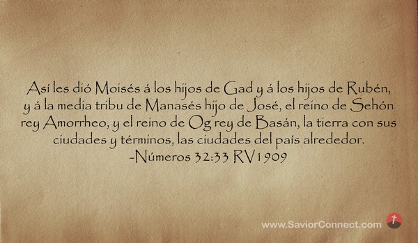 Así les dió Moisés á los hijos de Gad y á los hijos de Rubén, y á la media tribu de Manasés hijo de José, el reino de Sehón rey Amorrheo, y el reino de Og rey de Basán, la tierra con sus ciudades y términos, las ciudades del país alrededor. -Números 32:33 RV1909