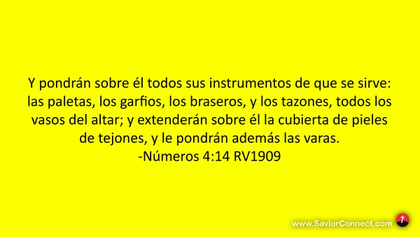 Y pondrán sobre él todos sus instrumentos de que se sirve: las paletas, los garfios, los braseros, y los tazones, todos los vasos del altar; y extenderán sobre él la cubierta de pieles de tejones, y le pondrán además las varas. -Números 4:14 RV1909