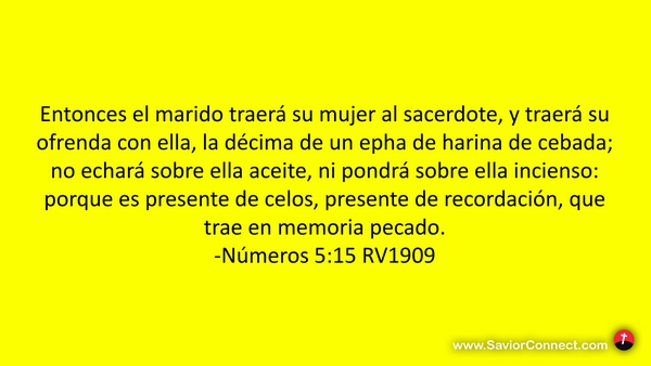 Entonces el marido traerá su mujer al sacerdote, y traerá su ofrenda con ella, la décima de un epha de harina de cebada; no echará sobre ella aceite, ni pondrá sobre ella incienso: porque es presente de celos, presente de recordación, que trae en memoria pecado. -Números 5:15 RV1909