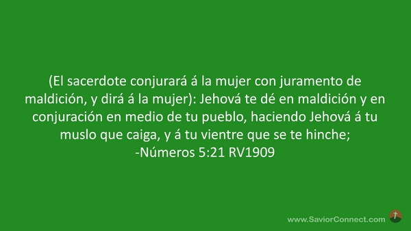 (El sacerdote conjurará á la mujer con juramento de maldición, y dirá á la mujer): Jehová te dé en maldición y en conjuración en medio de tu pueblo, haciendo Jehová á tu muslo que caiga, y á tu vientre que se te hinche; -Números 5:21 RV1909