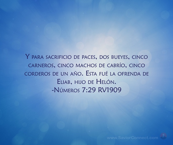 Y para sacrificio de paces, dos bueyes, cinco carneros, cinco machos de cabrío, cinco corderos de un año. Esta fué la ofrenda de Eliab, hijo de Helón. -Números 7:29 RV1909