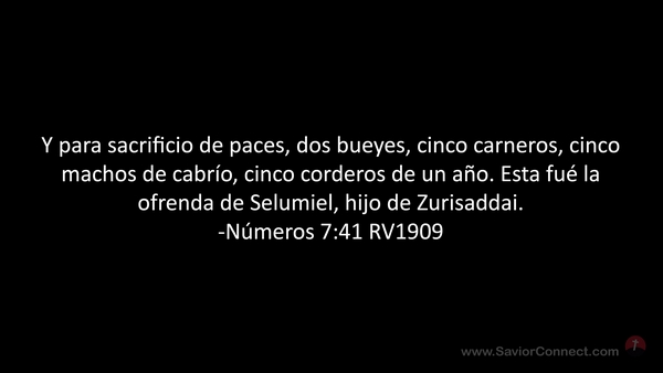 Y para sacrificio de paces, dos bueyes, cinco carneros, cinco machos de cabrío, cinco corderos de un año. Esta fué la ofrenda de Selumiel, hijo de Zurisaddai. -Números 7:41 RV1909