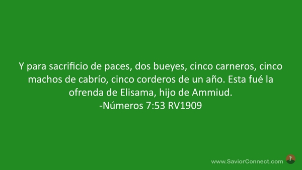 Y para sacrificio de paces, dos bueyes, cinco carneros, cinco machos de cabrío, cinco corderos de un año. Esta fué la ofrenda de Elisama, hijo de Ammiud. -Números 7:53 RV1909