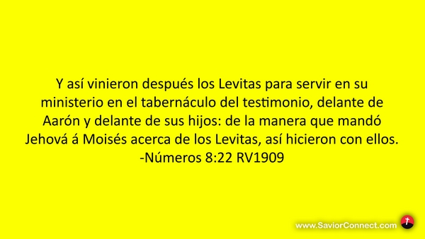 Y así vinieron después los Levitas para servir en su ministerio en el tabernáculo del testimonio, delante de Aarón y delante de sus hijos: de la manera que mandó Jehová á Moisés acerca de los Levitas, así hicieron con ellos. -Números 8:22 RV1909