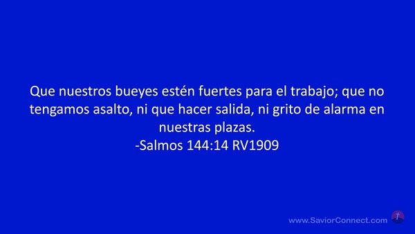 Que nuestros bueyes estén fuertes para el trabajo; que no tengamos asalto, ni que hacer salida, ni grito de alarma en nuestras plazas. -Salmos 144:14 RV1909