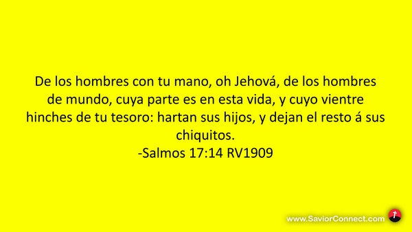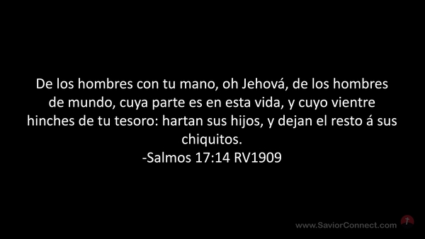 De los hombres con tu mano, oh Jehová, de los hombres de mundo, cuya parte es en esta vida, y cuyo vientre hinches de tu tesoro: hartan sus hijos, y dejan el resto á sus chiquitos. -Salmos 17:14 RV1909