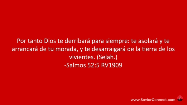 Por tanto Dios te derribará para siempre: te asolará y te arrancará de tu morada, y te desarraigará de la tierra de los vivientes. (Selah.) -Salmos 52:5 RV1909
